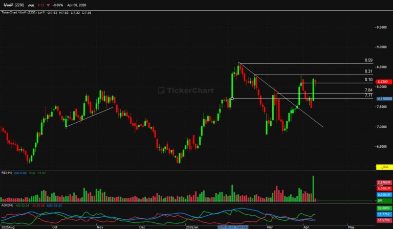 الكيميائية2230يتداول السهم في اتجاه عرضي علي المدي القصير ، أعلي مستوي 8.10 يستهدف مستوي 8.31 ريال ثم 8.59 ريال مع...