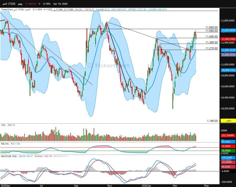 أنهى المؤشر جلسة الاحد عند مستويات 11464 هابط 89-نقطةالدعوم الحالية للمؤشرالدعم الحالي 11380المقاومات الحالية للمؤشرالمقاومه الحالية للمؤشر 11590