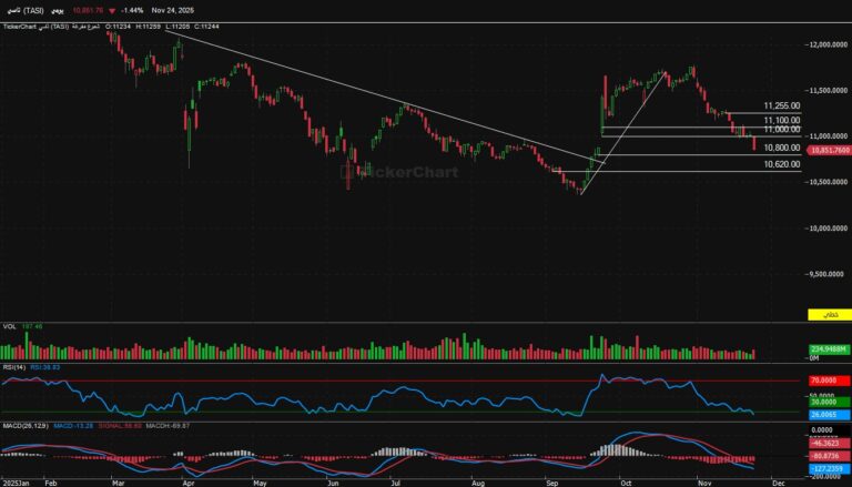 إغلاق جلسة اليوم الاثنين 24/11/2025 أغلق مؤشر على 10851, بسيوله بلغت اكثر من 7.2 مليار ريال بانخفاض 159- نقطه بنسبه...